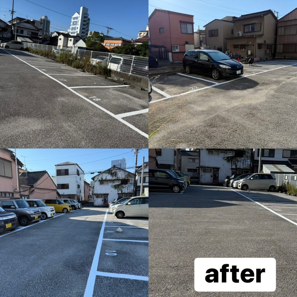 駐車場のライン番号が見えづらく、特に夜間に分かりにくいとのことで管理会社様よりご依頼をいただきました。既存のラインを丁寧に清掃・補修したうえで、視認性の高い塗料を使用し、はっきりと見えるように施工いたしました。利用される方にも分かりやすく、安心して駐車いただける仕上がりとなりました。この度はペイント工房和にご依頼いただき誠にありがとうございました。